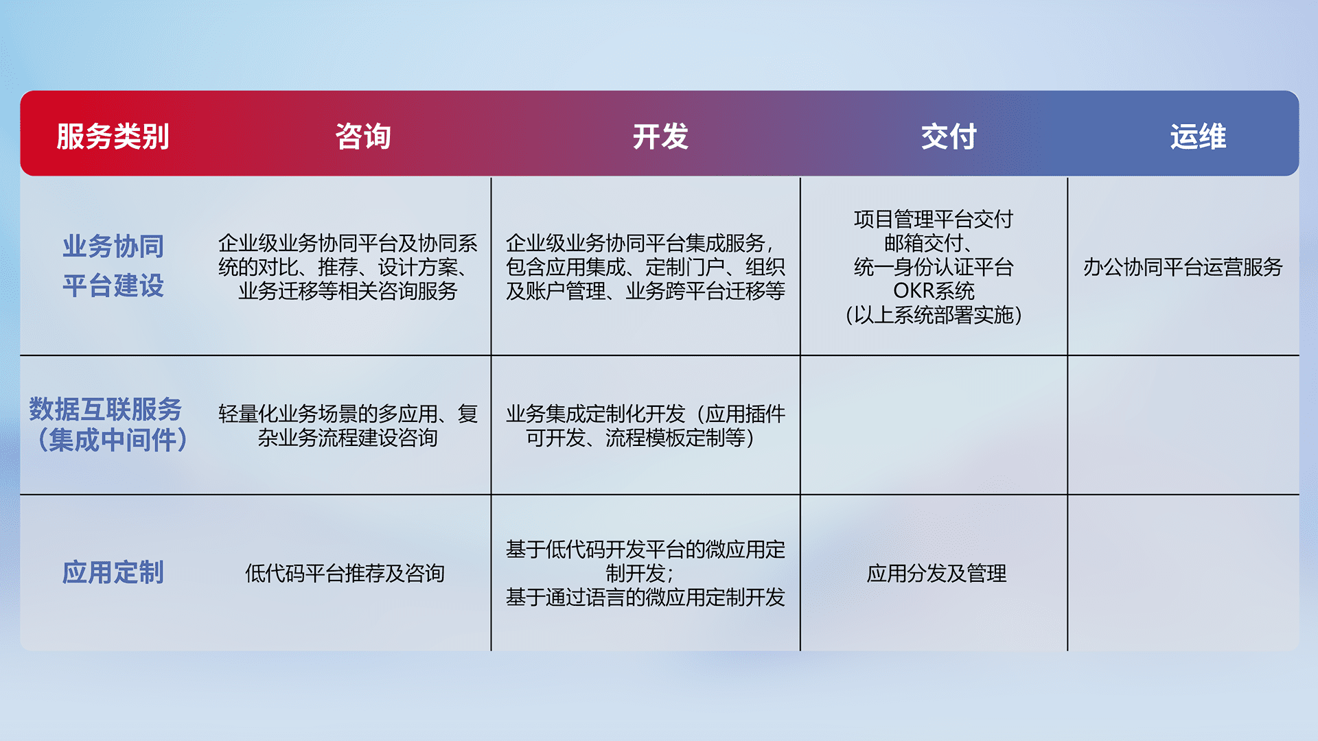 针对钉钉、、企微、、IDaas等平台级产品提供产品的规划、、、、方案、、、、交付、、定制化开发等服务,,,实现如统一协同办公、、、智能客户服务、、、、混合会议管理、、智能数据查询、、、等业务场景,,,,实现数字化转型。。