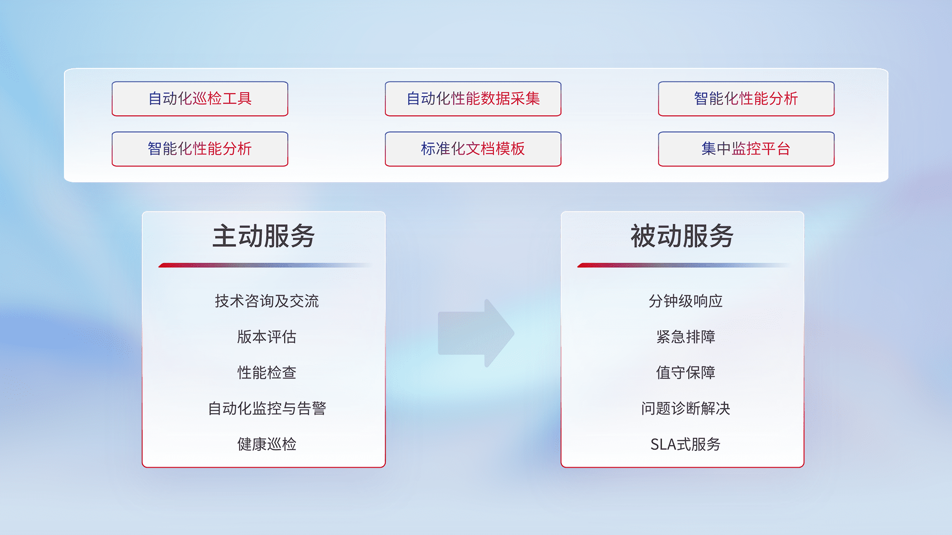 智能化工具和标准化文档,,保障服务质量,,,,提供主动服务(包含技术咨询、、、、版本评估、、、性能检查、、、自动化监控与告警、、、、健康巡检)和被动服务包含(分钟级响应、、、、紧急排障、、、、值守保障、、、问题诊断解决、、SLA服务)。。
