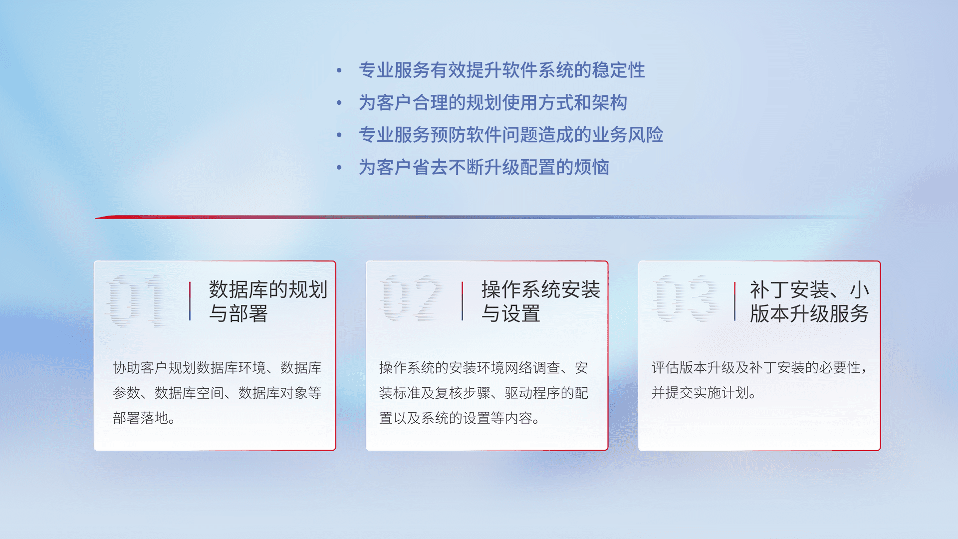 为客户提供软件规模升级、、快速部署、、按需配置的专业服务,,从数据库的规划与部署到操作系统的安装与设置,,,,再到补丁安装和小版本升级提供支持。。。。